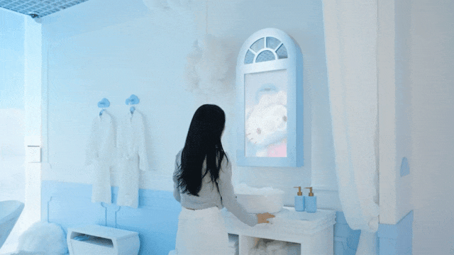 在玉桂狗的云端浴室,游客不僅能看到布滿泡泡的夢幻場景,還能體驗(yàn)擦拭霧蒙蒙鏡子的互動裝置。